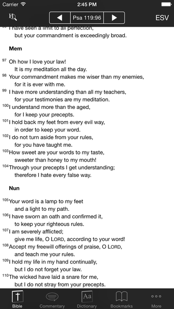 يمكنك قراءة الكتاب المقدس، واختيار فصل معين وقراءته من هناك، أو الانتقال إلى أي جزء من الكتاب المقدس.